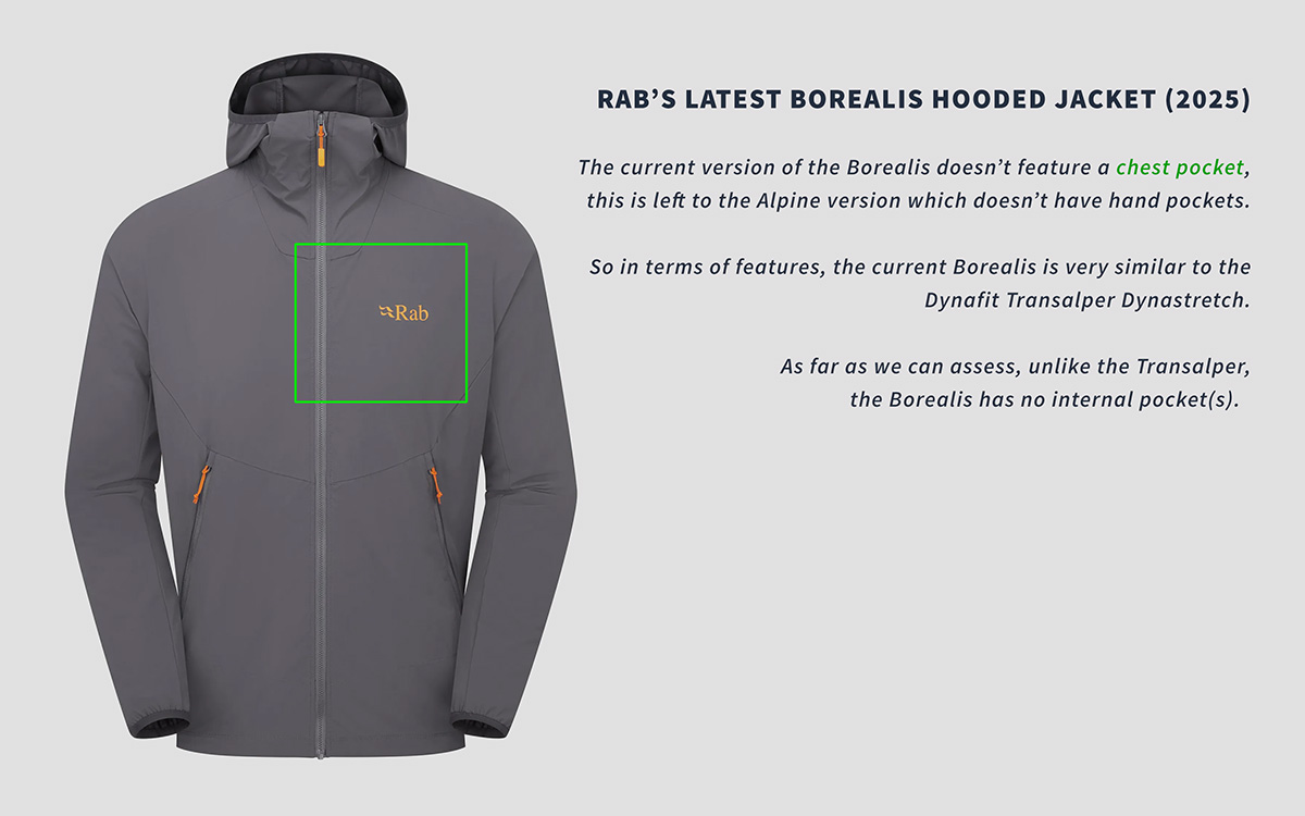 Dynafit's Transalper Dynastretch Jacket (we'll refer to it simply as the Transalper from now on) is a rather traditional softshell. In fact, Rab's latest Borealis offering (the 2025 Borealis Hooded Jacket), at least in terms of its feature-set, is quite the doppleganger; a full-zipped, nylon-based, hooded softshell jacket, with two hand pockets (as pictured below).