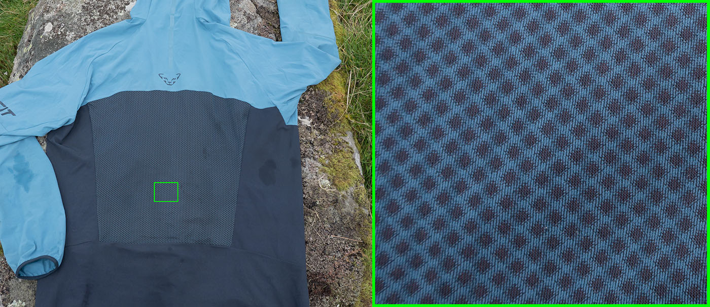 The other aspect, apparent on closer inspection, that's purposefully woven into its design is breathability. Clearly Dynafit want their over-heating, fast movers to vent. There are minuscule perforations in the "Dynastretch Dots" (dark blue) torso fabric, as well as larger laser cut dots at the sides and up under the arms. Most noticeable is the large Warpknit Air Mesh venting panel on the back.