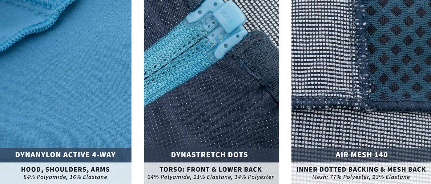 | Materials (Torso, Dark Blue): Dynastretch Dots (Nylon / Elastane / Polyester) | 64% / 21% / 14% |
