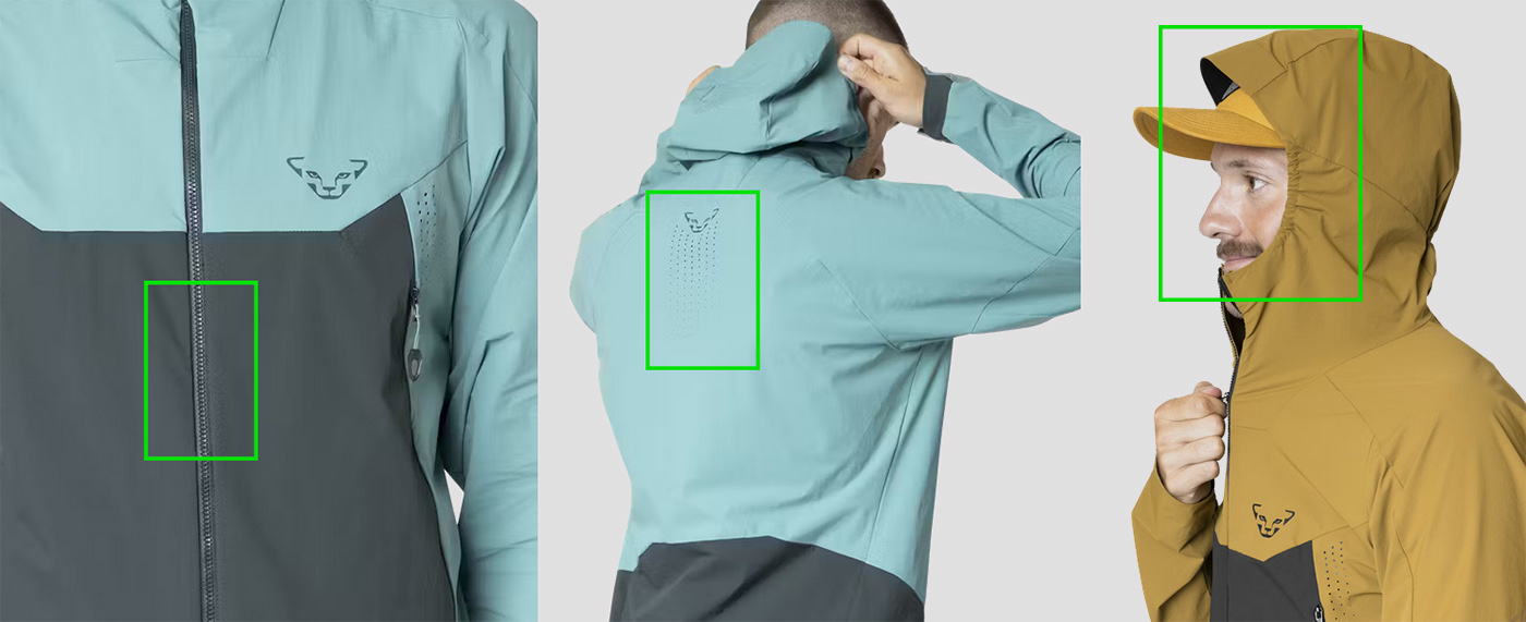 The latest version appears to have switched out the reverse coil zips for YKK Vislon zips. So, that's no longer an issue. Furthermore, we don't need to worry about the durability of the Air Mesh panel, since they've removed it and have replaced the panel with an array of laser-cut venting holes / dots (pictured below, centre). Also, the hood now seems to have a reinforced peak (below right), so the hood issue may well also have been remedied. We only just saw this before publishing our review (Dynafit have both versions live and for sale on their site and we just saw what must be the new release).